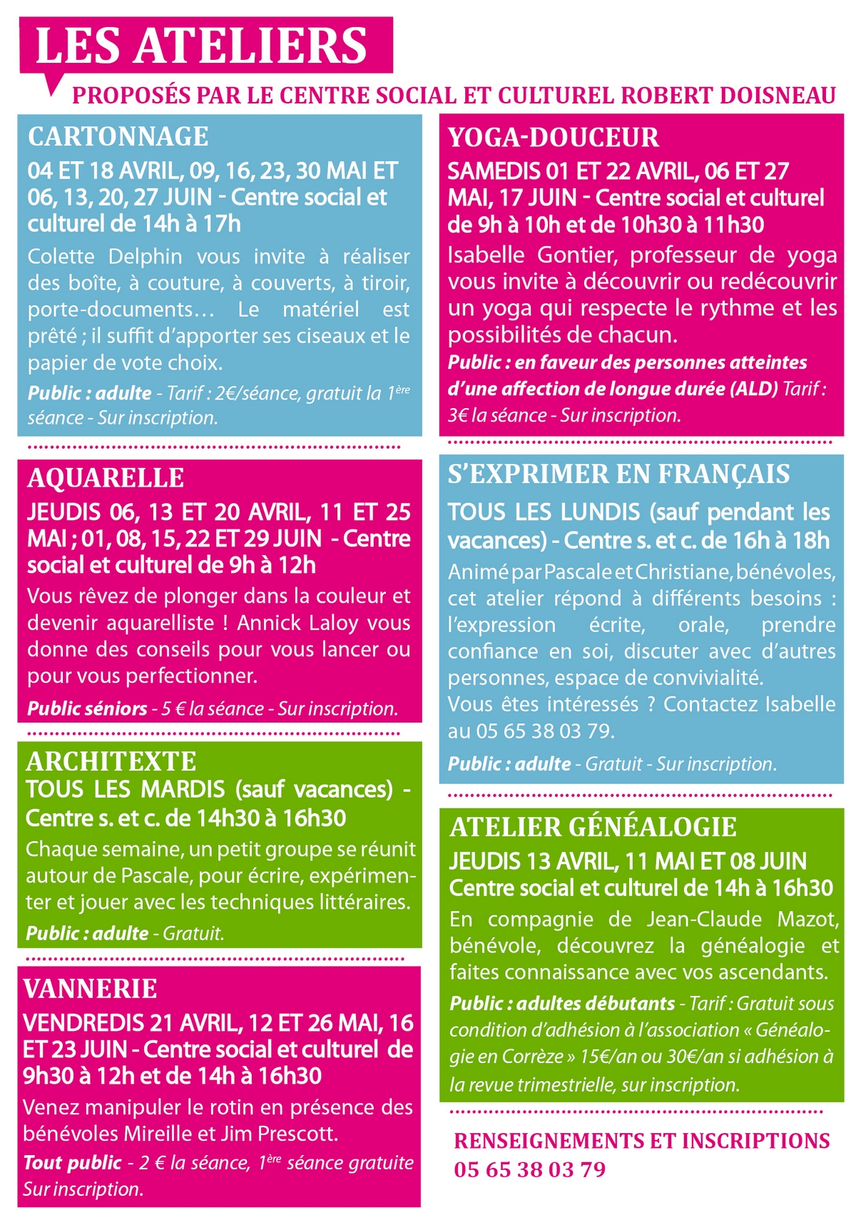 Les services du centre social et culturel Robert Doisneau proposent de nombreux ateliers. Retrouvez-les ci-dessous.