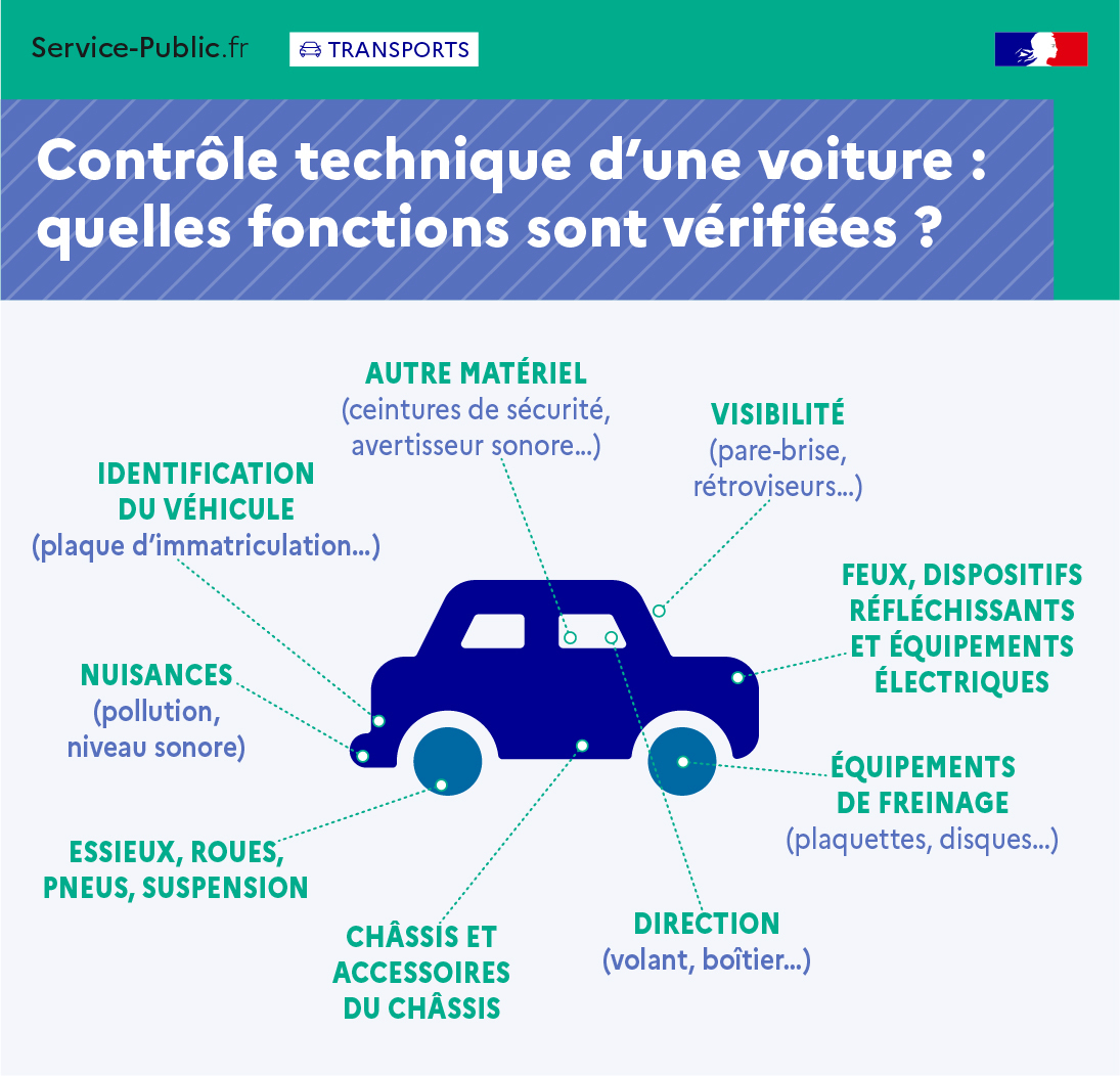 Les fonctions vérifiées lors du contrôle technique d'une voiture sont les suivantes :