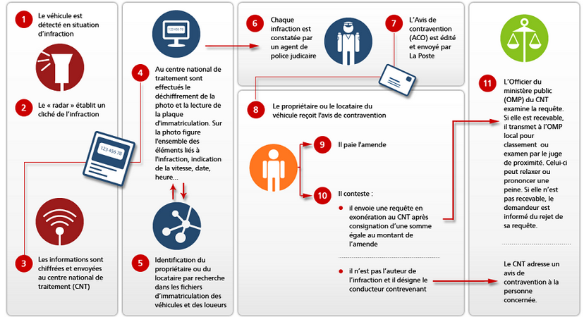 Étapes depuis le flash radar jusqu'à l'envoi de l'amende au propriétaire ou au locataire du véhicule et les possibilités de paiement ou de contestation